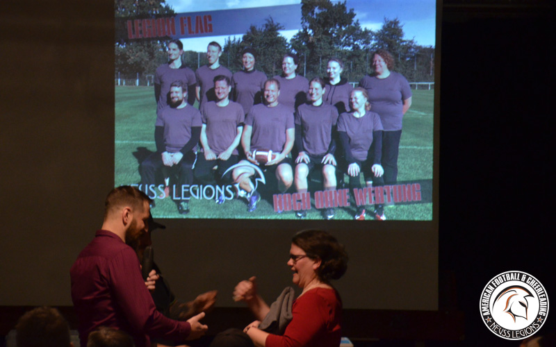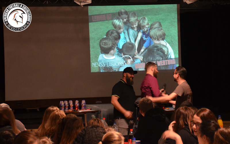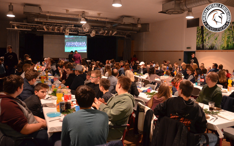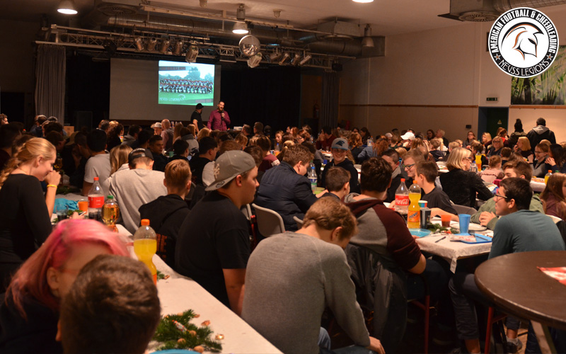 Traditionell wie in den Vorjahren kam die Legions-Family am Tag nach Thanksgiving zur Weihnachtsfeier zusammen. Und wieder einmal staunte man nicht schlecht, wie stark man wieder gewachsen war! Mit über 250 Teilnehmern war der Raum, der uns vor zwei Jahren noch viel zu groß erschien, diesmal bis auf den letzten Platz gefüllt. Kein Wunder, waren nicht nur die einzelnen Teams über das Jahr gewachsen, sondern kamen mit der Flag U7, den Cheerleading PeeWees und den Senior Flags sogar drei neue Teams dazu! Viel Gelegenheit also, bei Bildern aus der Saison und angeregten Gespräche Rückblick auf das zu Ende gehende Jahr zu halten und sich gleichzeitig voll Zuversicht auf das kommende zu freuen.